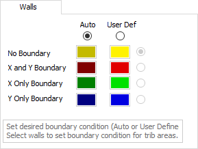 The Walls tab allows you to set boundary conditions for how walls are considered for design strip tributary generation. The default conditions are set to automatically consider walls as X and Y boundaries. Options are given for you to manually define how walls are treated, using a User Def (define) set of boundary options.