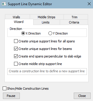 The Dynamic Editor contains six tabs; Wizard, Limits, Criteria, Walls, Middle Strips and Trim. Each of these are described in the following sections. The Show/Hide Construction Lines checkbox lets you choose whether or not to show the lines in the model you are working with.