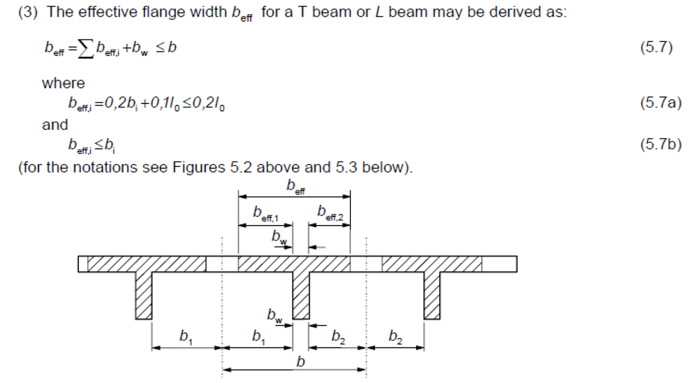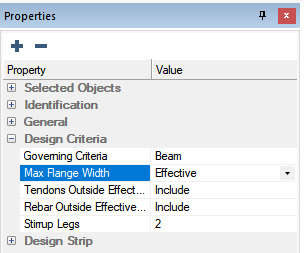 The program includes the option to calculate the effective flange and properties of beams when the support line is snapped to a beam component. The design of the beam sections is performed using the effective properties. The component of stress related to the precompression uses the full tributary area of the section as does the graphical precompression result. ACI and EC2 calculations for effective width are supported.