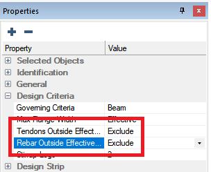 Two additional options to include or exclude tendons and rebar outside of the effective flange become available. If these options are set to Exclude, the program will ignore the area of prestressing steel or mild reinforcement that fall within the modeled tributary but outside effective flange, for calculation of reinforcement for the design section.