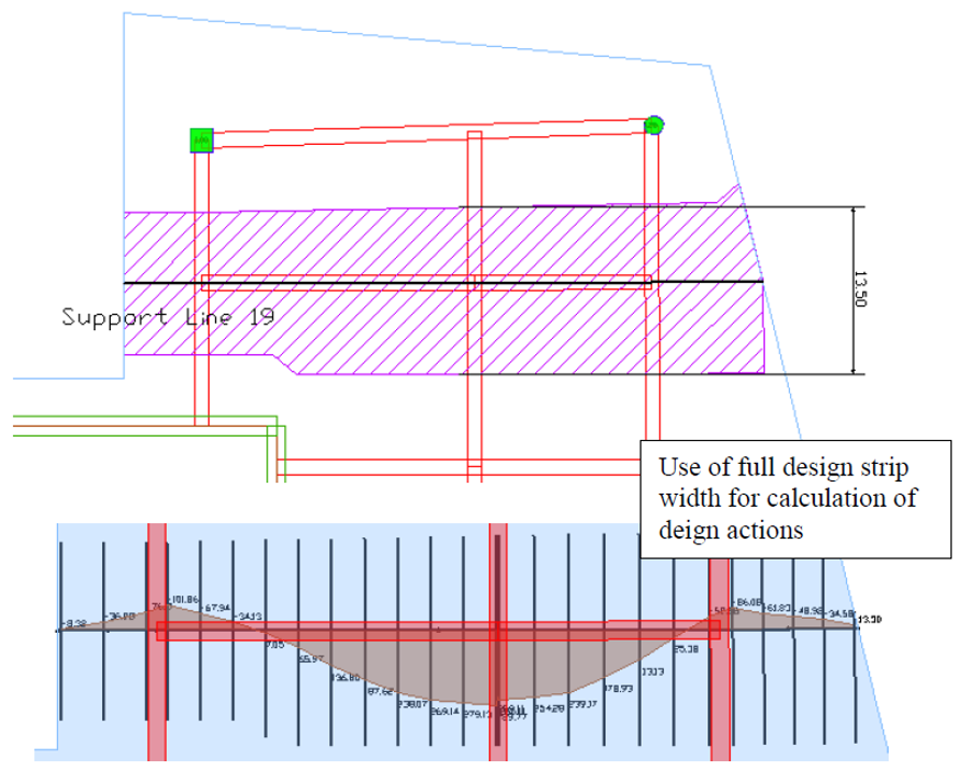 Note for the image below, the generated design strip is taken as the full tributary of 13.5 ft (162 in). The design actions reported at each design section along the support line are based on nodal integration of the actions over the full width of the generated design strip.