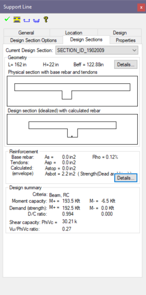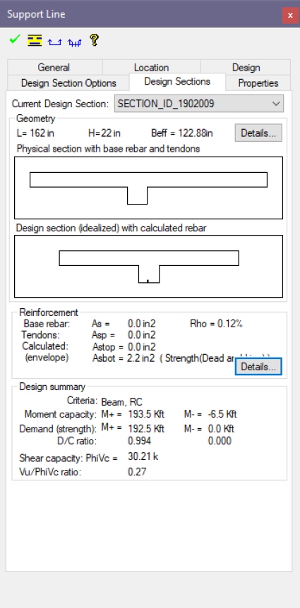 Double click on a design section to bring up the design section window. The image below shows the properties of a design section with consideration of effective flange properties. While the generated design strip width is 162in., the effective flange width as used in the calculation of reinforcement and flexural stress is taken and calculated as 122.9in. The window below shows two images. The first is the physical section cut and the second is the idealized section cut which uses the effective flange.