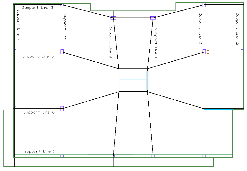 Support line tributary regions break the model into design strips along the support line. Once support lines and splitters have been entered into a model, you can Create Tributary Regions Automatically or Create Tributary Regions Manually. If the tributaries are created automatically, the user retains the ability to Modify Tributary Regions as needed.
