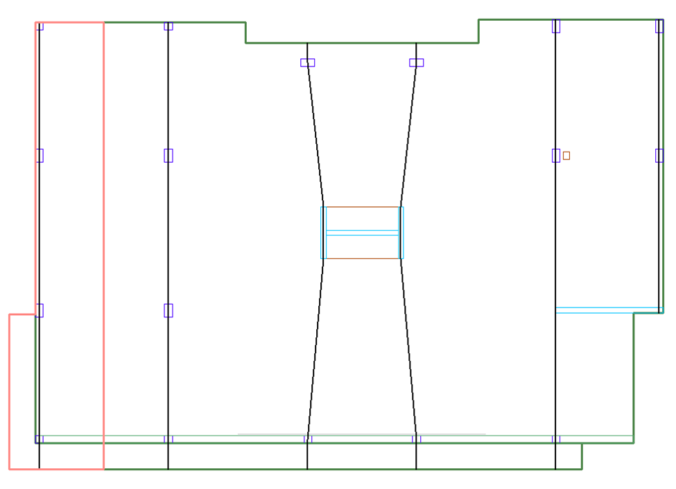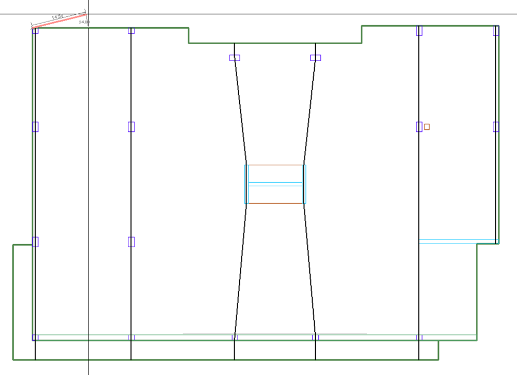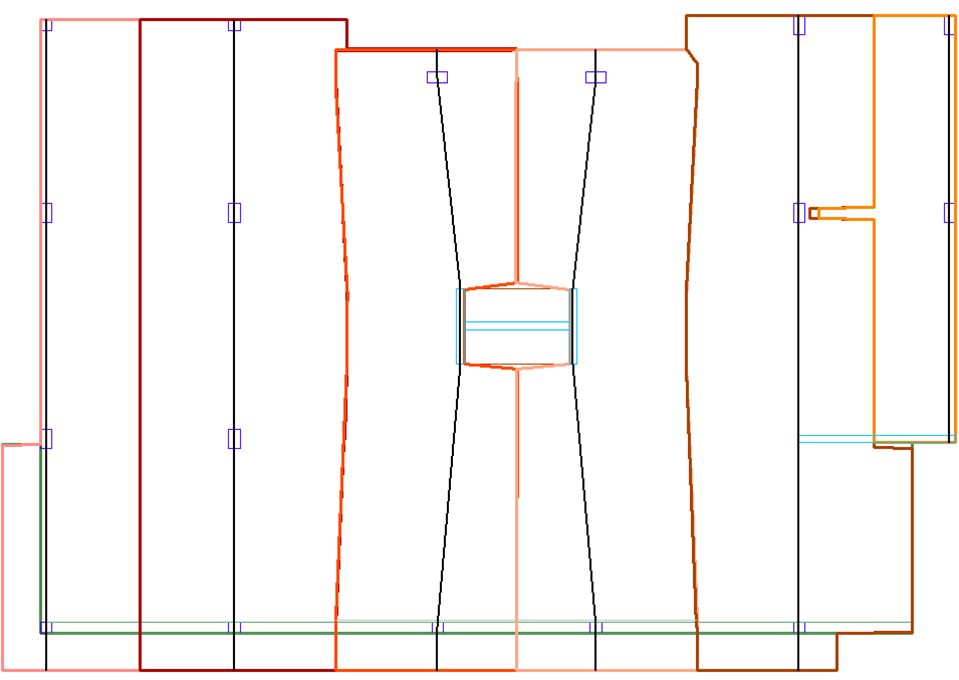 The tributary regions will display on the screen for that direction. An example of Y-Direction tributary regions for our example model is shown below. The user may need to turn off the design sections by going to Floor Design>Section Design and click on the Display Design Sections icon to see a view similar to the image below.