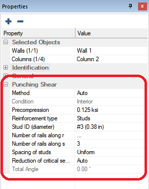 Local properties can be found in the Properties Grid panel when selecting columns or walls. The Properties Grid includes a Punching Shear tree containing Punching Shear analysis and design parameters.