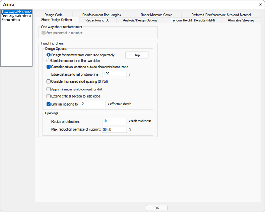 For details on each of the individual global punching shear properties, please see the Criteria: Shear Design Options - tab topic.
