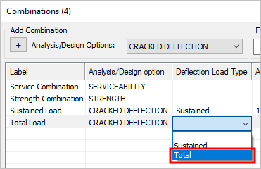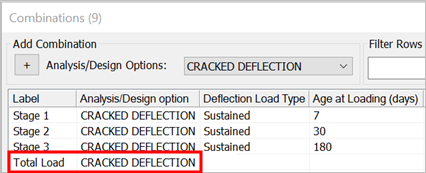 Click in the Analysis/Design option cell in the row for this newly created combination and choose CRACKED DEFLECTION from the menu.