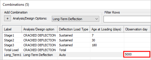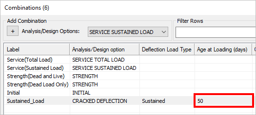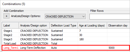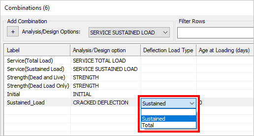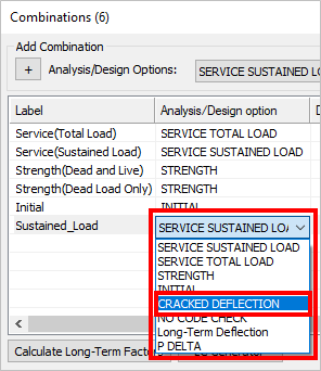 Click in the Analysis/Design option cell in the row for this newly created combination and choose Long-Term Deflection from the menu.