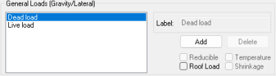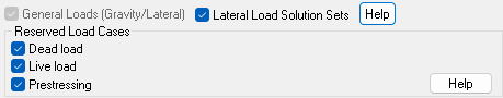 | General Loads (Gravity/Lateral) | Opens the General Loads (Gravity/Lateral) section of the load case manager. This option is always on and cannot be modified by the user. |