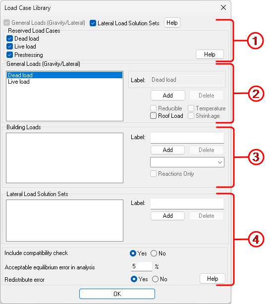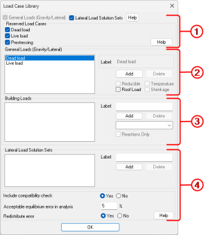 General Options - The general options section allows the user to turn on or off the Lateral Load Solution Set section of the load case manager as well as turn on and off some of the reserved load cases.