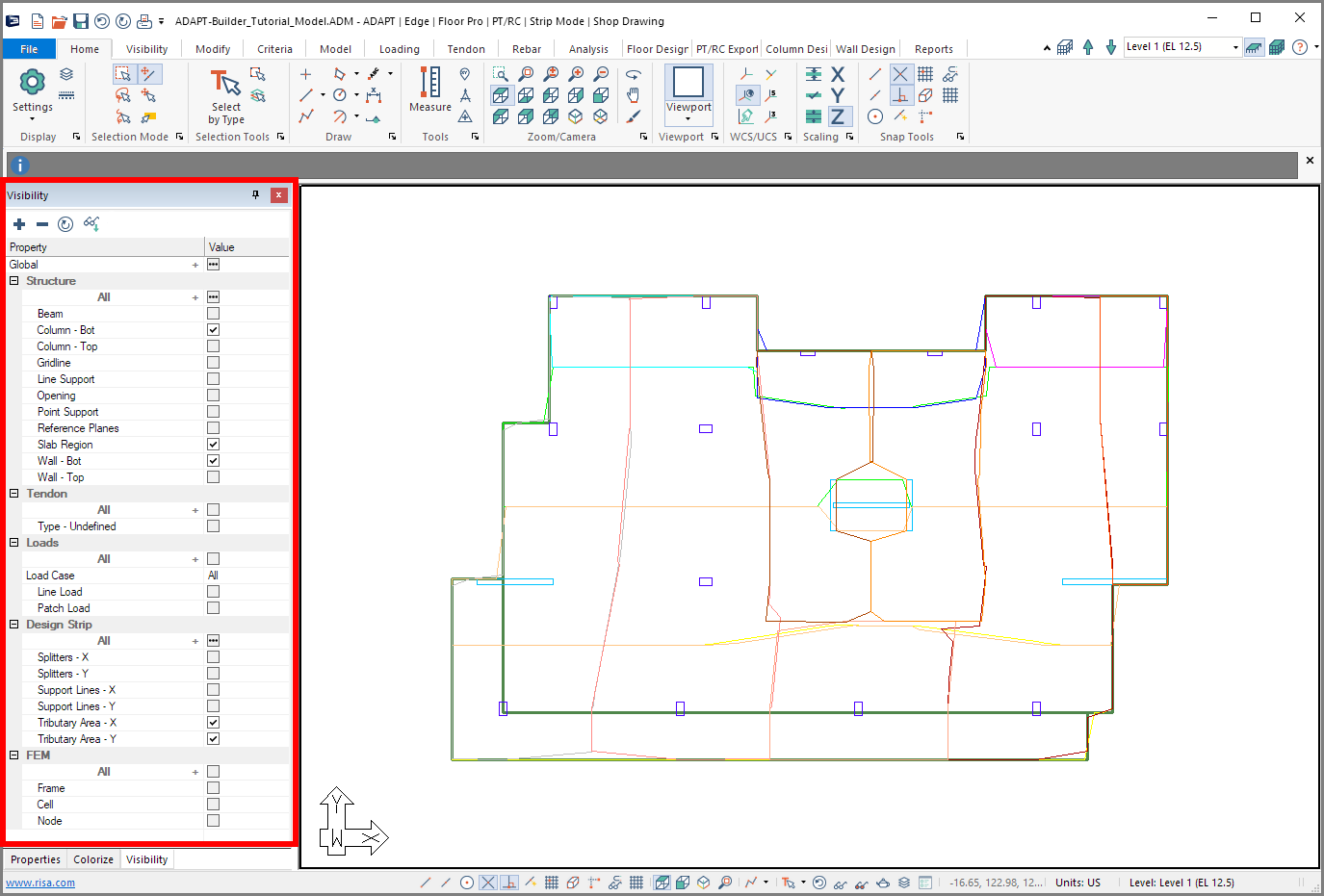 In the following example, we have turned off the visibility for some of the Structural components, all of the Tendon components and one of the FEM components, as indicated by the unchecked check boxes under those three categories. Notice how those components are hidden from view in the model space.