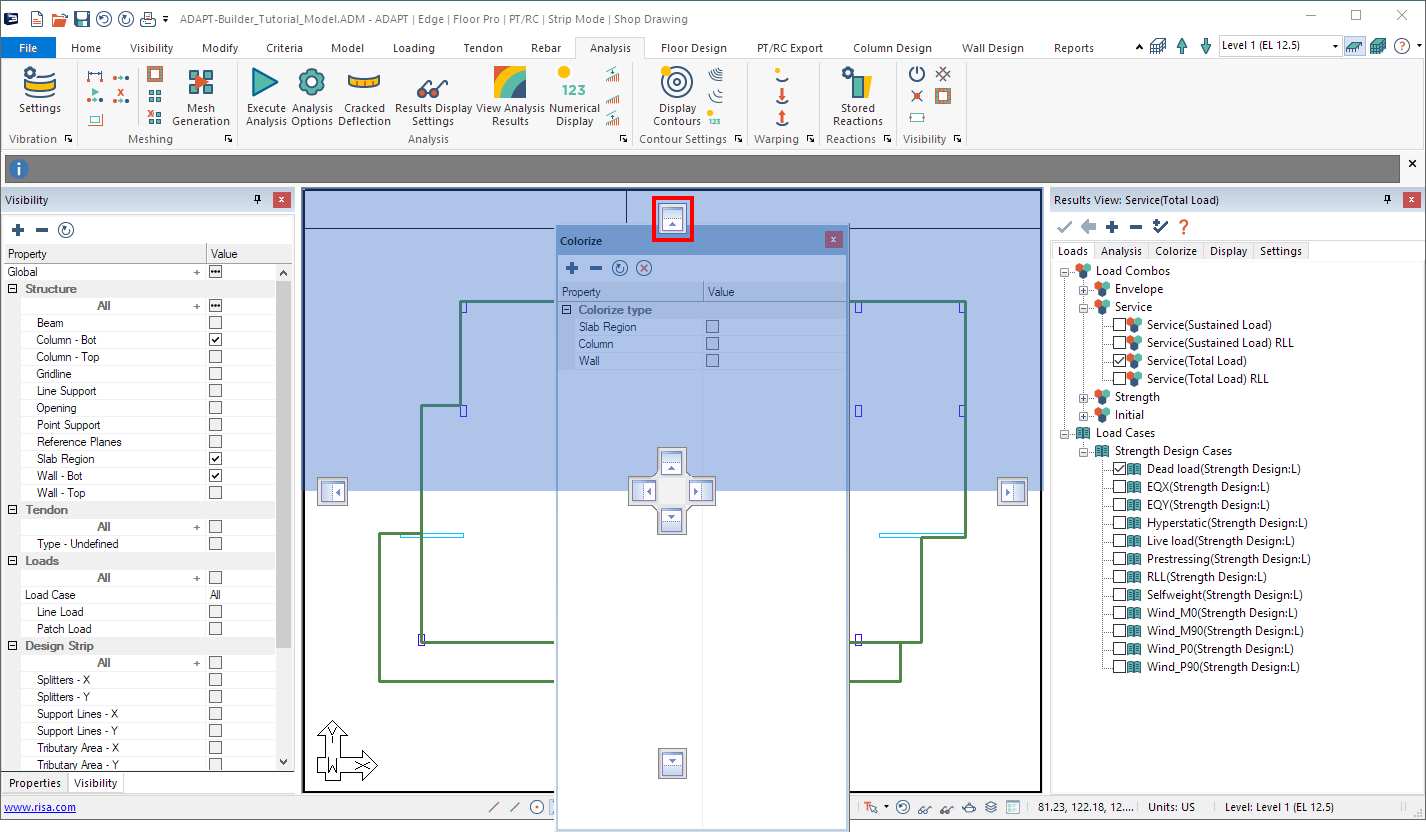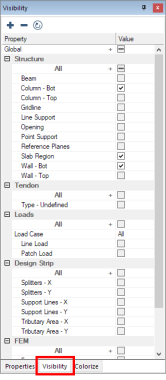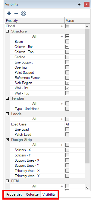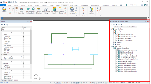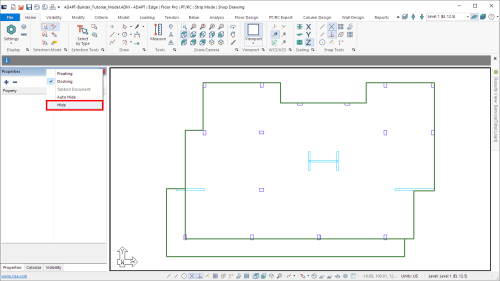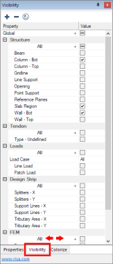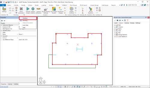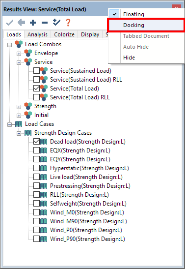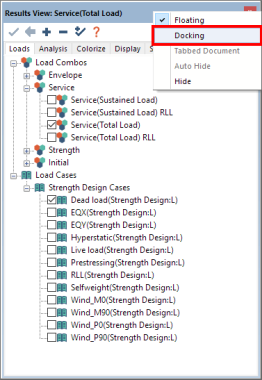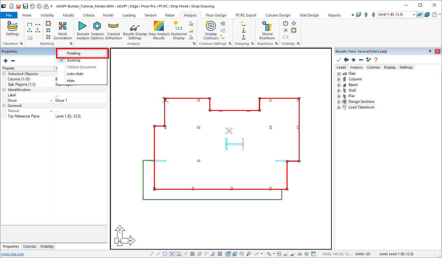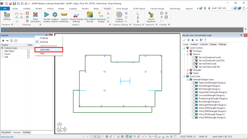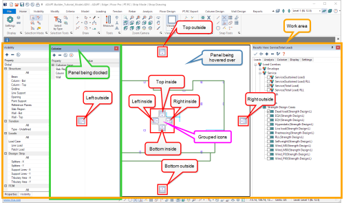 In ADAPT-Builder, you have the ability to float, dock or hide several of the panels that by default are docked to either the left side or right side of the model editor panel. Some examples are the Properties Grid, Colorize Grid, Visibility Grid and Results View panels. The panels are interchangeable, meaning that they can be moved in and out of a grouped panel set or you can create a grouped panel out of a stand-alone panel by docking other panels with it. These features allow you to move the panels where they are most convenient for you, group as you see fit, and hide them when not in use so you have more space to work on a model. Each panel can be docked, floated or hidden independently of each other, or all together when they are within a grouped panel set.