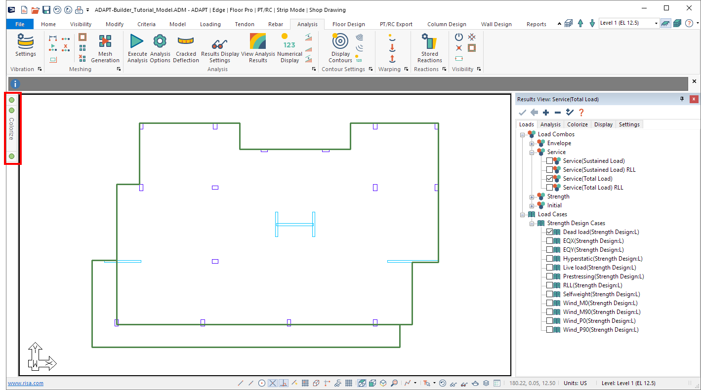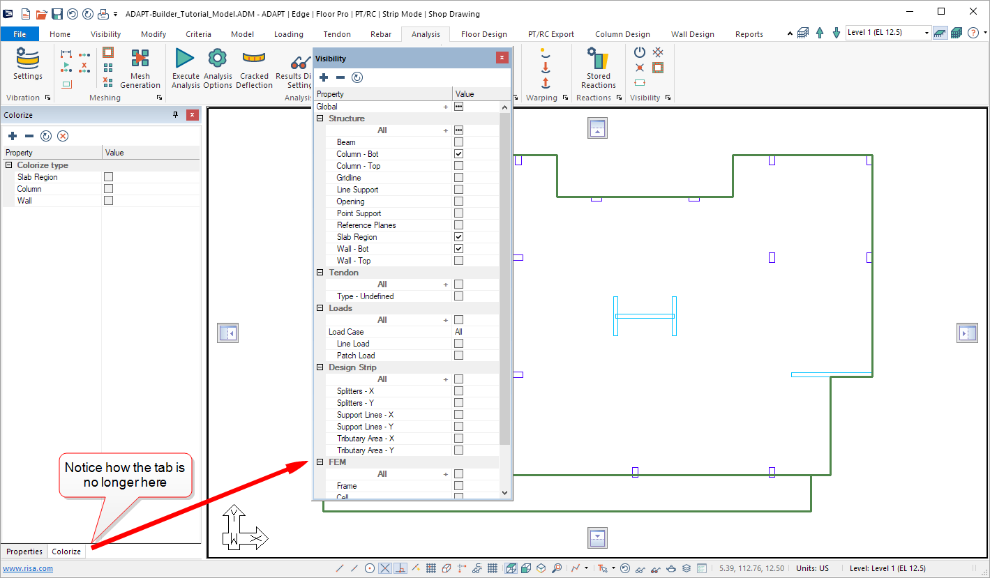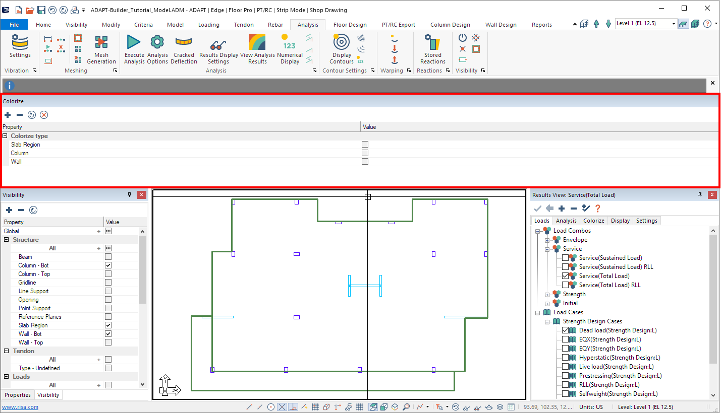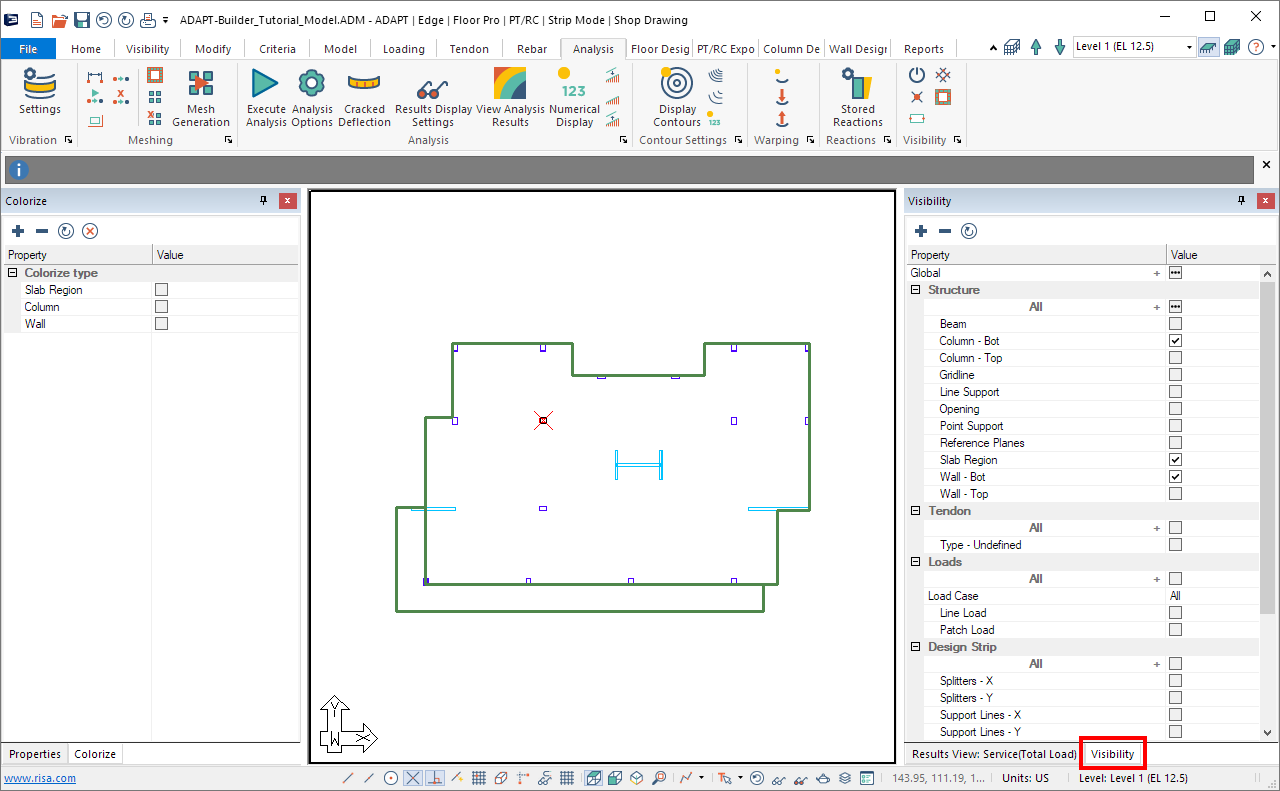 In ADAPT-Builder, you have the ability to float, dock or hide several of the panels that by default are docked to either the left side or right side of the model editor panel. Some examples are the Properties Grid, Colorize Grid, Visibility Grid and Results View panels. The panels are interchangeable, meaning that they can be moved in and out of a grouped panel set or you can create a grouped panel out of a stand-alone panel by docking other panels with it. These features allow you to move the panels where they are most convenient for you, group as you see fit, and hide them when not in use so you have more space to work on a model. Each panel can be docked, floated or hidden independently of each other, or all together when they are within a grouped panel set.