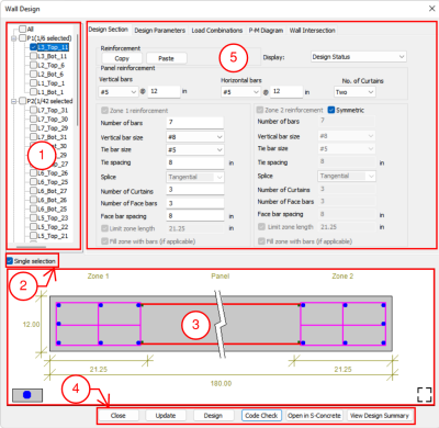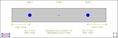 Graphical Design Section Window – This window allows the user to view the selected design section with accompanying zone and panel reinforcement and dimensions. The window can be toggled to different modes as described below.