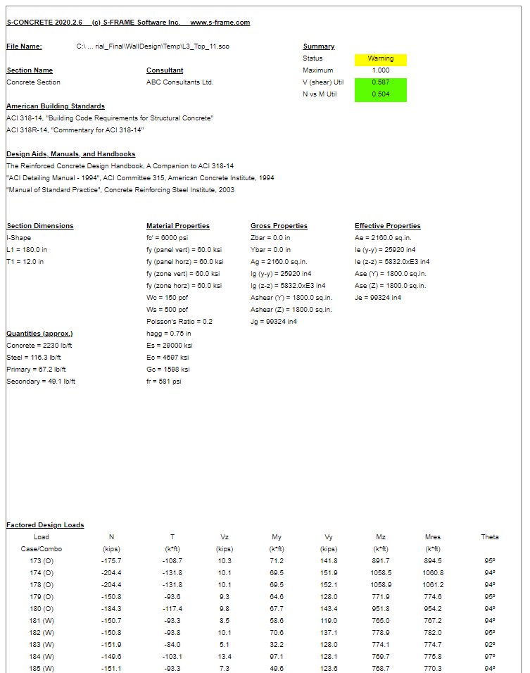 The Wall Design Summary report has a different format when S-Concrete is the design tool.