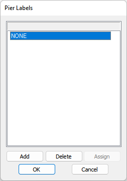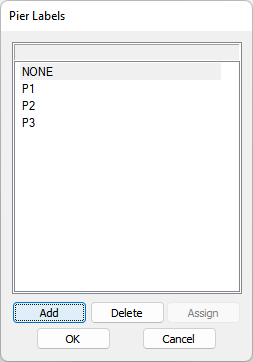 In the Pier Label dialog window click on the Add button one time for each unique pier in your model. In this example we clicked the Add button three times.