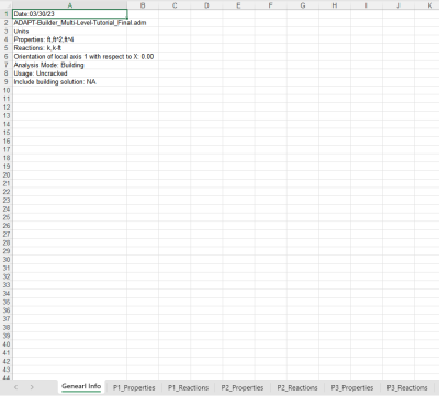 The figures below show examples of the pier reaction data report. These include General Information, Pier Properties, and Pier Reactions. Each pier defined in a model will have its own set of data.
