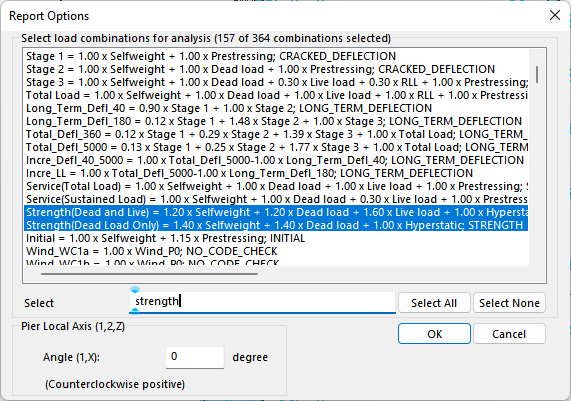 Select the Pier Reactions to be reported in the Report Options dialog window that opens. Note that you can also choose to produce the reaction report relative to a user-defined orientation angle which transforms the shear and moment values