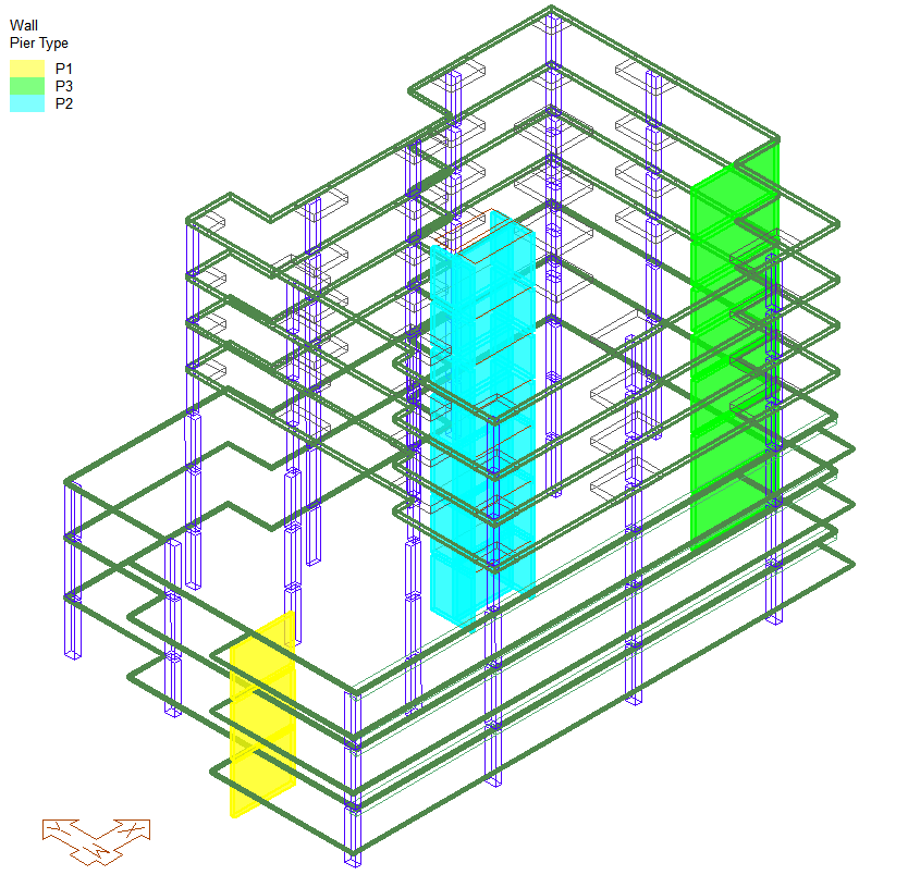 Wall piers are commonly defined as those walls contained in one composite group for the purpose of acting as a lateral resisting component in the global lateral resisting system. In the example image below the model contains three wall piers acting as lateral resisting elements and grouped such that all design sections are referenced to the same wall pier.