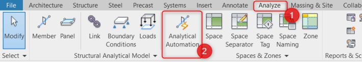 Open the "Analytical Automation" tool under the "Analyze" tab in Revit as shown below: