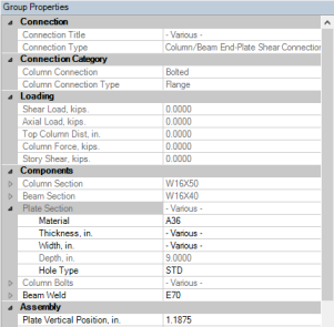 In the Group Properties you can modify connection properties for all of the connections within this group at one time. The grayed out properties are properties brought over directly from Tekla Structures; these properties can not be edited in RISAConnection.