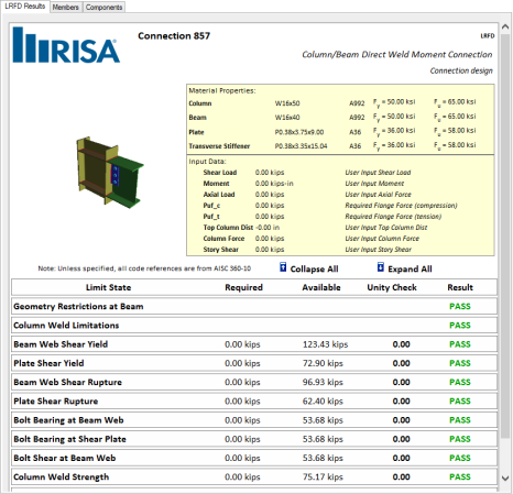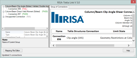 1. Open the RISA-Tekla Link results viewing dialog and show graphically whether a connection passes or fails.