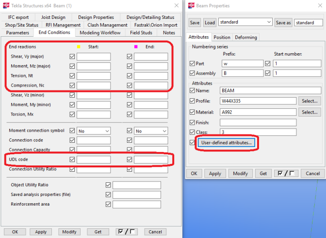 Double-clicking on a member and clicking the User-defined attributes... button and going to the End Conditions allows a user to define end reactions on a member. These end reactions will then be transferred to RISAConnection appropriately. Note that you can use the UDL code field in place of the Shear, Vy (major). Please see the UDL section for more information on how this works.