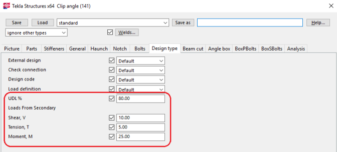 RISAConnection accepts the Shear, Tension, and Moment fields for each connection. It will also accept a value in the UDL % field in place of the Shear, V. Please see the UDL section for more information on how this works.