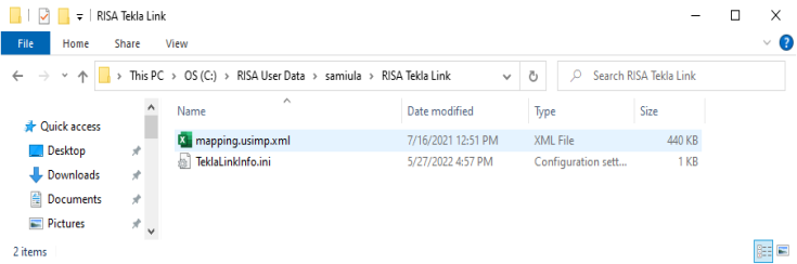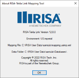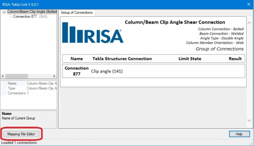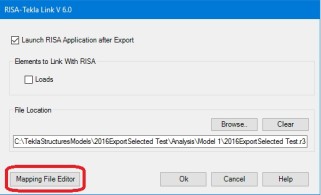 Tekla Structures and RISA-3D/RISAConnection have different nomenclatures for how elements are named. To map these names between the two programs a mapping file is generated by the RISA-Tekla Link for each Tekla Structures environment: