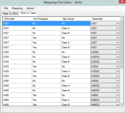 When this button is pressed the Mapping File Editor will open. When it opens the program will read the shape, material and bolt information from the environment you are currently working in. It will also read from the associated RISA shape database. Finally, it will read and populate the dialog with information from the given mapping file.