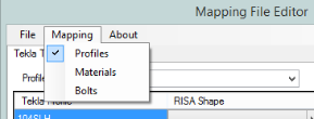 Each item (profiles, materials, bolts) has a separate view with both "Tekla to RISA" and "RISA to Tekla" tabs. When a change is made to mapping behavior this change will automatically occur on both tabs.