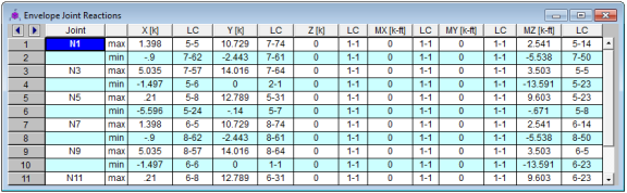 For these result spreadsheets, the maximum and minimum values are shown for each section location, for each active member. The governing load combination and step location is also shown for each result value under the "LC" column. The first number is the load combination, the second is the step number: (load combination - step number).