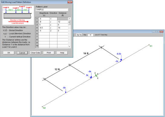 When you add a new pattern, the new pattern must have a unique name and can consist of up to 50 different loads. The sign of the load Magnitude will control which way the load is pointing in the direction specified in the Direction field. The direction field can be any of the 3 global directions or the 3 local directions for the members that the load will travel over. Note that if your load travels over multiple members, a local direction load will be applied based on the local axes of each member it crosses over. There is also a special code, “V”, which causes the load to be applied in the direction of the current vertical axis, whatever it is (X, Y, or Z). The Distance is the distance between the loads.