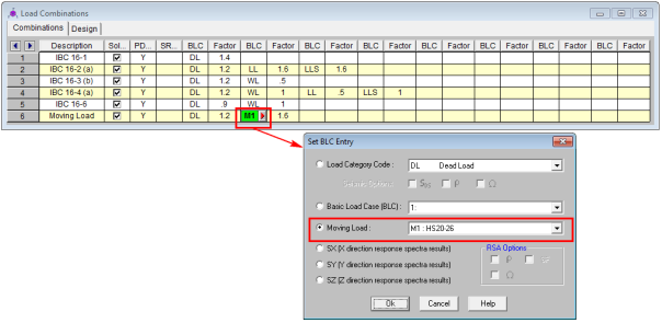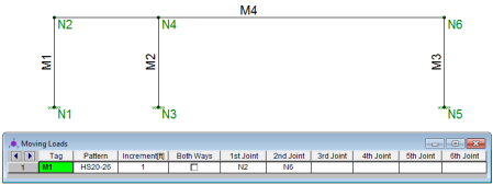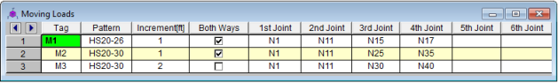 Each moving load definition is automatically assigned a Tag on the left side of the spreadsheet. These labels may not be edited. Moving loads are included in your analysis by referencing this label on the Load Combinations spreadsheet.