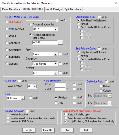The Use? check boxes next to the data fields indicate whether the particular parameter will be used or not when the modification is applied. If the box next to a field is checked, that parameter will be applied to any selected members, if the box is NOT checked, the parameter will NOT be applied, even if a value is entered in the field. This lets you easily change one or two properties on members without affecting all the rest of the properties. Note that if no value is entered in a field (I.e. the field is blank) and the corresponding check box is checked, clicking "Apply" will have the effect of clearing the data for these fields. For example, to remove all member end-releases for the currently selected members, just erase any text in the I and J release fields, click their Use? check boxes so that they're checked, and then click on "Apply".