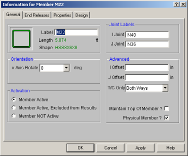 General - This tab let’s you view edit the member’s label and end joints. The rigid end offsets, orientation, and activation state can also be viewed and modified here. The shape pictured will change depending on the shape type of the member. It will also change to reflect wood members. If the member is made inactive here, you will need to activate the member from the Members spreadsheet, or by using the Criteria Select feature to find and select inactive members.