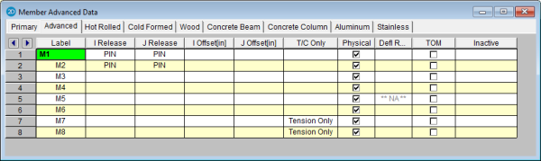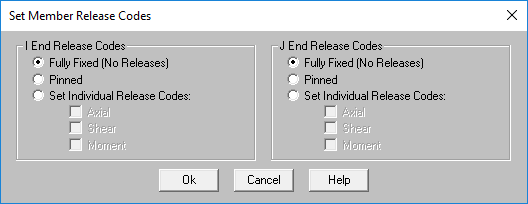 button on the Window toolbar.The I Release and J Release fields are used to designate whether the forces and moments at the ends of the member are considered fixed to or released from the member's points of attachment (the I and J joints). Each member has 3 force components at each end (axial, shear, and bending). Any or all of these force components can be released from the member's point of attachment. If a force component is released, that force is not transferred between the joint and the member.
