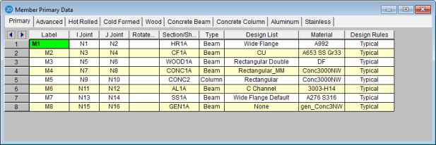 button.The parameters shown are the same as those on the Hot Rolled, Cold Formed, Wood, Aluminum, or Concrete tab of the Members spreadsheet.
