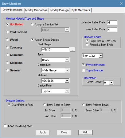 All member properties may be assigned graphically either as you draw or later as a modification to the members.