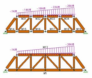 To understand the benefits of Physical Members see the trusses in the following figure. The first truss shows the chords modeled without physical members and thus with multiple members modeling each chord. The second truss models each chord with one Physical Member. Both models will yield the same results. However the Physical Member model is more intuitive and easier to work with because you don’t have to work with multiple members when you create the chords, load them, edit them or evaluate their results. Notice that the distributed load may be defined from start to end for the Physical Member. In the other model the distributed load end magnitudes have to be specified for each of five members in order for the entire load to be defined.