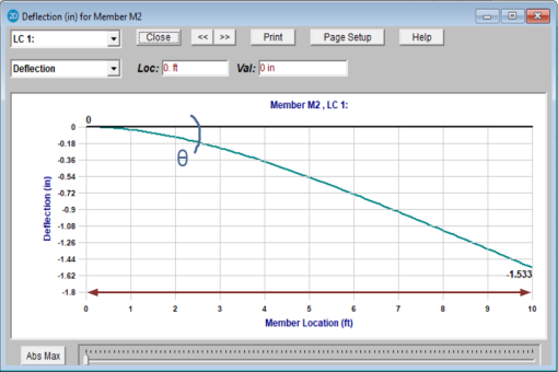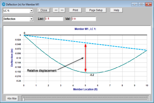 For members with a cantilever end, the location of the maximum relative deflection will be at the free end of the member. The displacement value is equal to the rotation at the supported end multiplied by the length of the member.