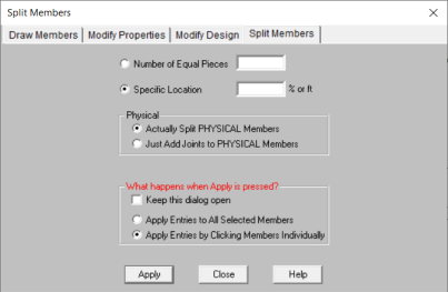 You may choose between Add Joints to Physical Members and Actually Split Physical Members. For Physical members it is likely that you will not want to actually split the member but prefer instead that joints be placed along the member so that you may specify other members, plates, loads or boundary conditions.