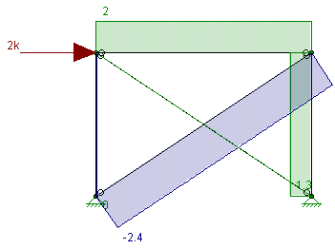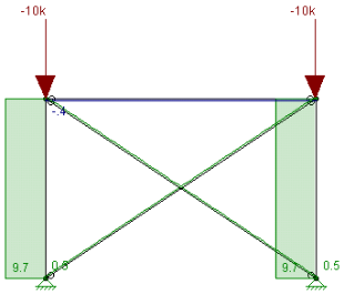 In the image above we can see that the "compression" brace has no force in it because it has it's stiffness reduced in the stiffness matrix and that all of the load is passing through the "tension" brace.