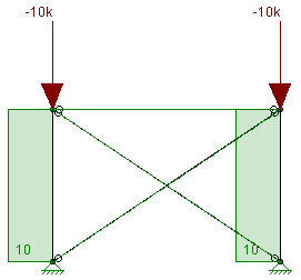 In this scenario the columns in this model undergo a small amount of axial shortening. This induces a small amount of compression and both of the tension-only braces have their stiffnesses reduced. This results in a frame that is unstable and illustrates the problem. The solution here is to use Euler buckling braces.