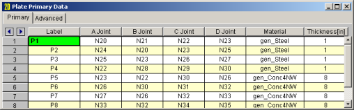 The Plates Spreadsheet records the properties for the plate/shell elements of the model and may be accessed by selecting Plates on the Spreadsheets menu.