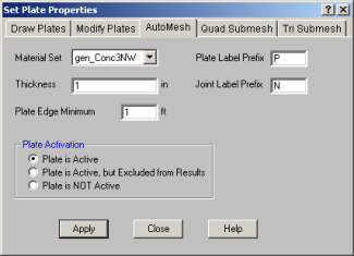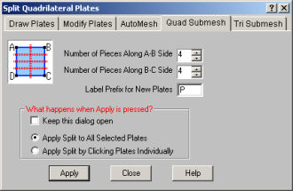 Meshing Options - The section allows you to mesh the current plate. You may choose between the auto-mesh function or the quad and tri submesh. Refer to the section on Modifying plates for information on meshing.