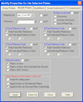 The graphical Plate Modify tool discussed here lets you modify the properties of plates that already exist in your model. To use this, you will typically specify the properties you want to change, then select the plates that you want to modify. You can modify plates one at a time by selecting the Click to Apply option and then click on the plates you wish to modify. You may also modify entire selections of plates by selecting the plates first and then use the Apply to Selected option. See the Graphic Selection topic for more on selecting.