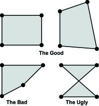 Finite elements are also affected by geometric distortion. The best shape for the 4-joint quadrilateral is a square. In practice, elements are frequently distorted, which is fine as long as they aren’t squashed too far out of shape. The largest internal angle should never be equal to or greater than 180 degrees, and preferably shouldn’t even approach 180 degrees.