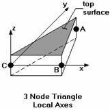 When the plate local axis is set to Nodal, the local x-axis is defined as positive from the D joint towards the C joint for 4 joint elements and from C towards B for 3 joint elements. The local y-axis is then placed as close to pointing towards the A-joint as possible. Note that for triangular elements, the y-axis will probably not pass through the A-joint. For 3 joint elements, the y-axis is “towards” the A-joint and perpendicular to the x-axis. Once the x and y axes are defined, the positive local z-axis is found using the right hand rule.