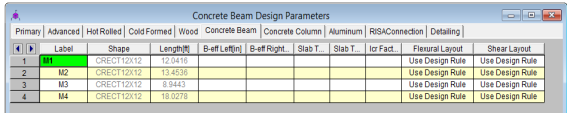 The Concrete Beam tab on the Members Spreadsheet records the design parameters for the code checks of concrete beams. These parameters may also be assigned graphically. See Modifying Member Design Parameters to learn how to do this.